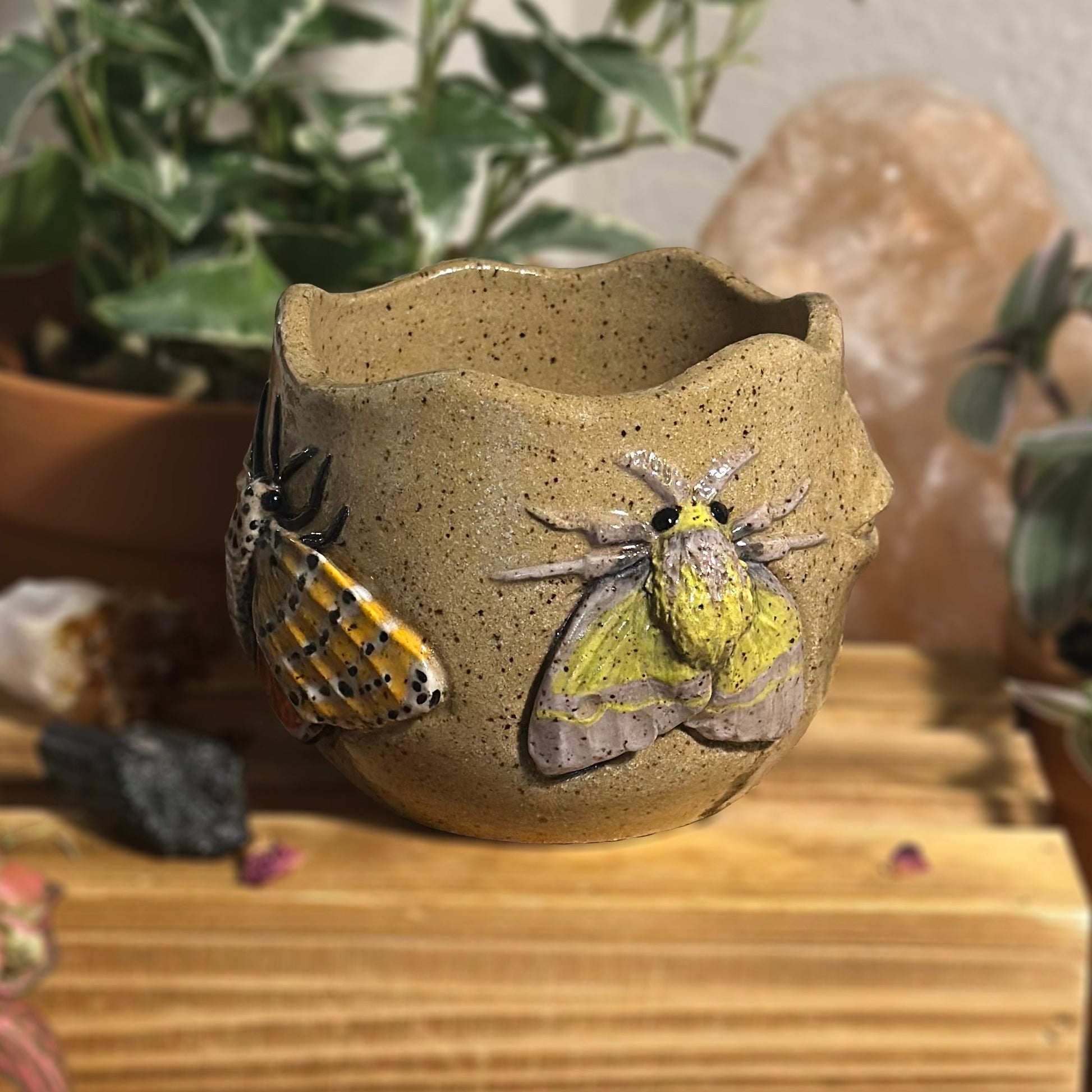 This piece was wheel-thrown and trimmed before the eyes and moths were sculpted and applied at leather-hard. It was under-glazed and bisque-fired, then coated with a zinc-free clear glaze for the glaze firing. Final finishing included wet sanding and polishing.