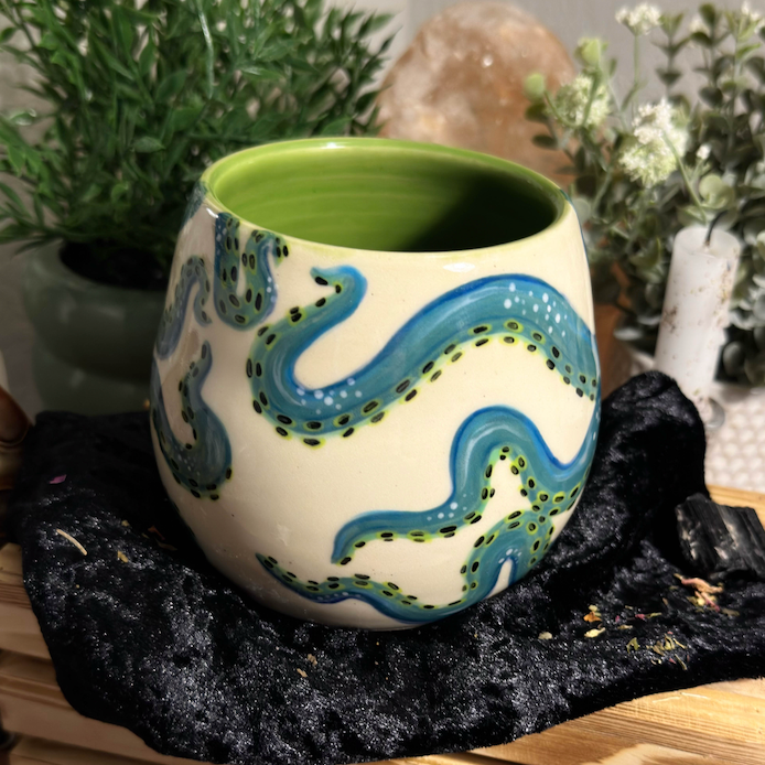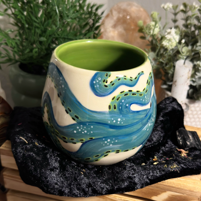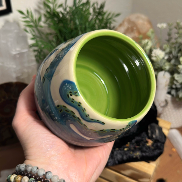 This vessel was wheel thrown and under-glazed by hand. It was fired, then glazed with a zinc-free clear on the exterior, as well as a green celadon glaze on the interior. It was then fired for a second and final time.